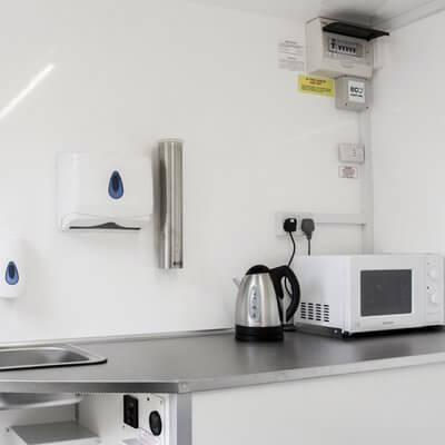 This 16ft welfare unit features a canteen area that can accommodate up to 12 people. There is bench seating, and a large dining table so that staff and workers can enjoy lunch in comfort. A kettle and a microwave are included as standard, and each run through inverters. The room also contains a soap dispenser, towel dispenser, waste container, fresh drinking water container, stainless steel sink, and carbon dioxide detector ensure that all hygiene, safety and basic needs are fully compliant with HSE regulations.