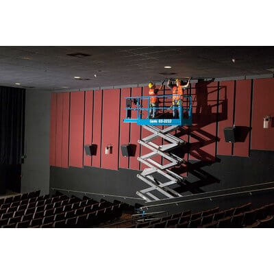 The Genie GS3232 has a safe working limit of 227kg and a 2.26m by 0.81m platform deck. You can lift two persons or tools and equipment, and they will have plenty of room to work. This efficient scissor lift offers 25% gradeability with 14° break-over angle to easily get up slopes and loading ramps. It also features automatic levelling hydraulic outriggers that level the machine on slopes up to 5Ëš for stability.