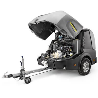 Karcher have put a lot of thought into their range of industrial pressure washers. The water temperature can be selected using a simple dial and, when cleaning with hot water, the water is pre-heated by the engine via an innovative heat exchange. This leads to fuel savings of up to 14%! The trailers that these diesel pressure washers are mounted on feature a tough and robust chassis with large wheels. The pressure washers are constructed from tried-and-tested Kärcher components; they are specifically designed to cope with the demands of challenging industrial cleaning jobs in remote locations.