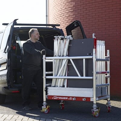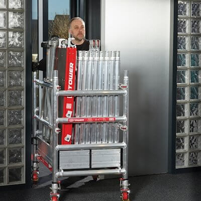 Whilst de-constructed, all of the parts of the access tower can fit neatly into its trolley base, which can then be wheeled around with ease through corridors, doorways and lifts by one person. The tower can be erected easily by just one person, without any tools, in just 10 minutes. The scaffolding sections fix together securely using a locking mechanism.