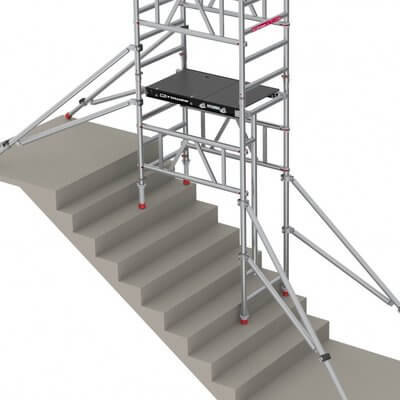 These stair scaffolds are available in a range of sizes. You can book a MiStair stair scaffold tower with a working height of 4.2m (2.2m platform), 4.7m (2.7m platform), 6.2m (4.2m platform) or 6.7m (4.7m platform). If you order a 6.2m tower, you have the option to build a small tower when required, using just some of the parts to reach a 4.2m working height. If you order a 6.7m tower, you have the option to build a small tower using just some of the parts to reach a 4.7m working height. The range of stair scaffold tower sizes that we offer allows a great range of access to complete all kinds of jobs above staircases and steps. You can full the full specs of each model below.