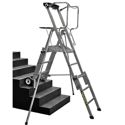 Mobile telescopic work platforms are available in two sizes. They are high-quality extendable aluminium step ladders with a non-slip platform from which you can work safely at a height. These adjustable mobile working platforms feature aluminium guardrails and toe boards around the work platform and a steel safety chain to prevent falls. They also have a splayed base and stabilisers for maximum stability. The telescopic legs on these ladders can be adjusted to offer varying working heights, and large, sturdy wheels at the back allow for easy transport and repositioning.