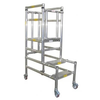 Podium Steps - 1.25m Platform heights 1m or 1.25m. Handrail height max 2.25m. Working Height 3.25m. Overall Width 0.68m. Overall Length 1.3m. Podium Steps - 1.5m Platform heights 1.25m or 1.5m. Handrail height max 2.5m. Working Height 3.5m. Overall Width 0.9m. Overall Length 1.3m. Components include 1 x folding frame, 1 x platform deck and 1 x access ladder section.